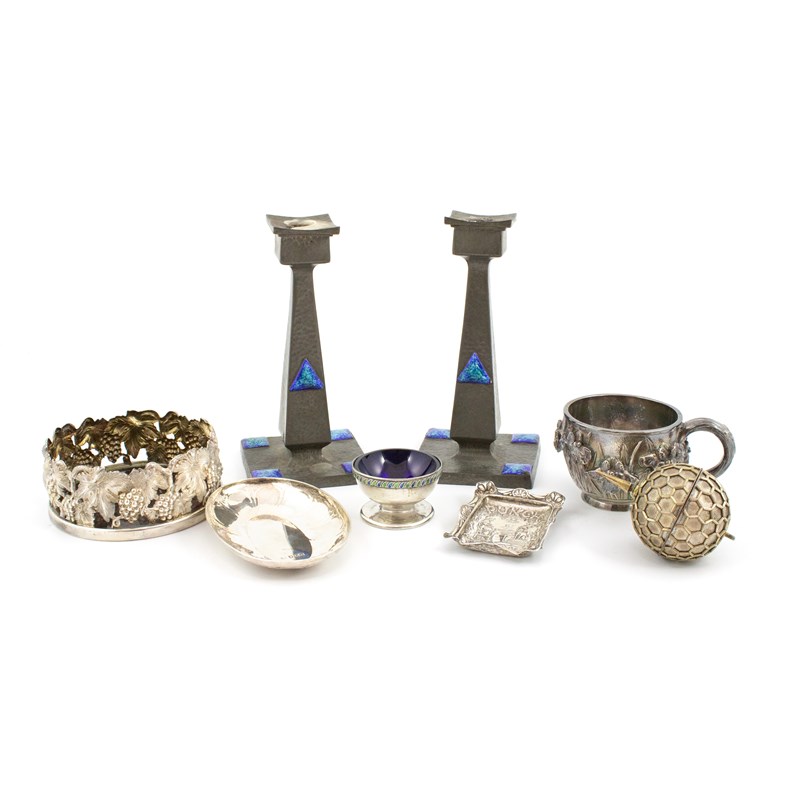 oblong form with spot-hammered decoration, length 15cm, plus a Liberty & Co. silver and enamel salt cellar, a Punch pin tray, a parcel-gilt hinged orb, a Japanese silver mug, an electroplated wine coaster, and a pair of pewter and enamel art nouveau candlesticks, total approx. weighable 17.9oz. (8)