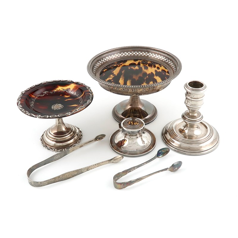 comprising: a silver and tortoiseshell tazza, London 1912, another silver and tortoiseshell tazza, by Mappin and Webb, a single dwarf candlestick, a pair of sugar tongs by Hester Bateman, a capstan inkwell and another pair of tongs. (6)