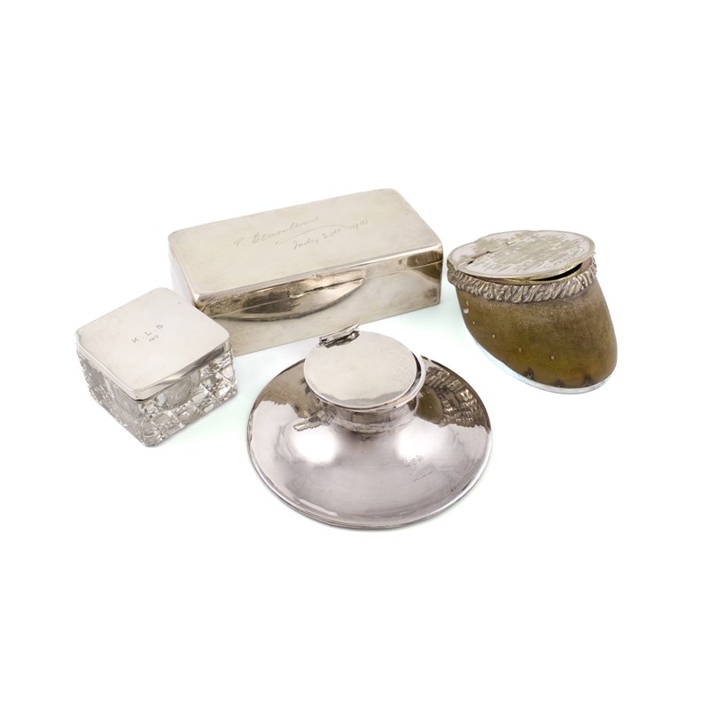 rectangular form, with an inscribed cover, plus two silver inkwells and an electroplated mounted hoof box, relating to the Meath and Louth Hounds, length 18.9cm, approx. weighable 2.4oz (4)
