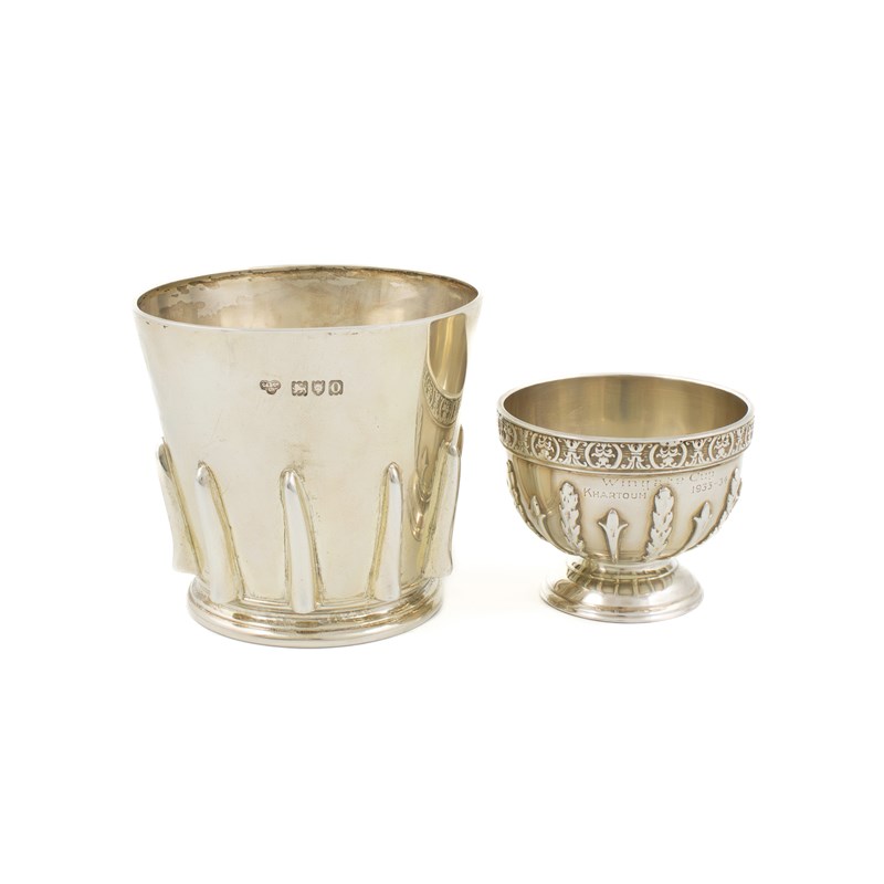 plain circular tapering form with surrounding ribbed decoration, height 8.3cm, plus a small silver presentation bowl, by Mappin & Webb, Birmingham 1932, circular form with foliate decoration, inscribed 'Wingate Cup Khartoum 1933-34', on a raised circular foot, total approx. weight 12.6oz. (2)
