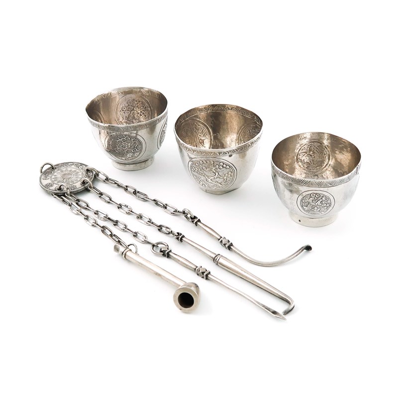 circular form, with panels of foliate decoration on a matted background, plus four Chinese smoking implements on chains hanging from a coin, approx. weight