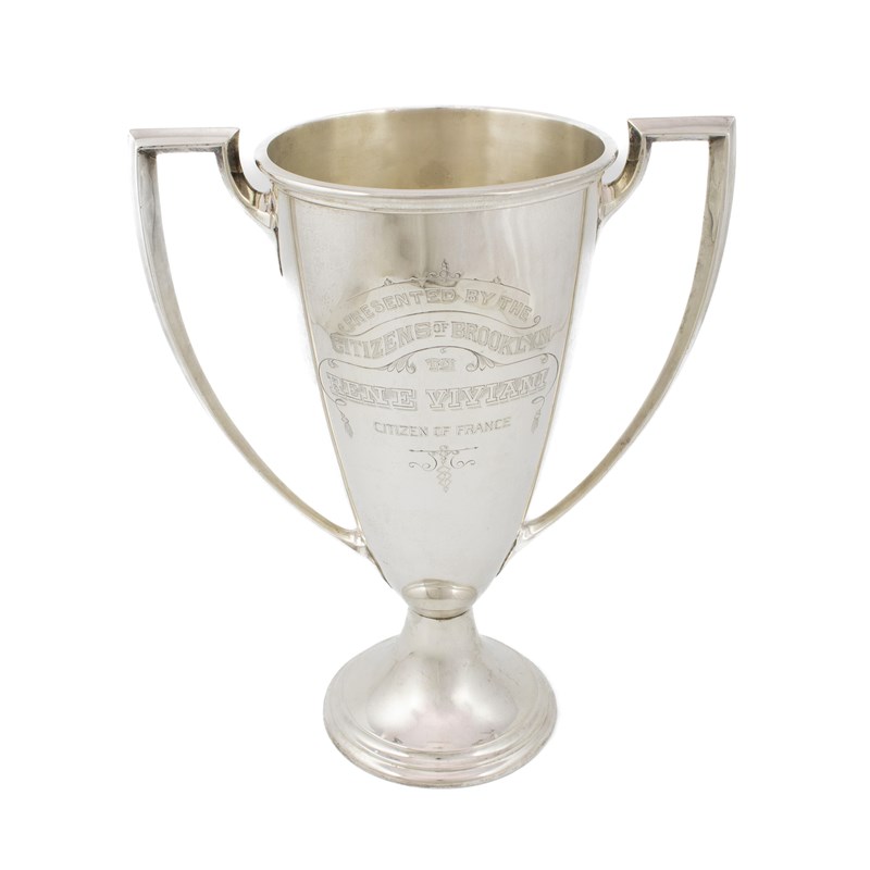 slender vase form, scroll handles, on a raised circular foot, inscribed 'Presented by the Citizens of Brooklyn to Rene Vivani Citizen of France', the reverse inscribed 'Commemorating a Visit to Brooklyn to Dedicate The Harteau Memorial to the Marquis De Lafayette, May 10, 1917', height 36cm, approx. weight 42oz.