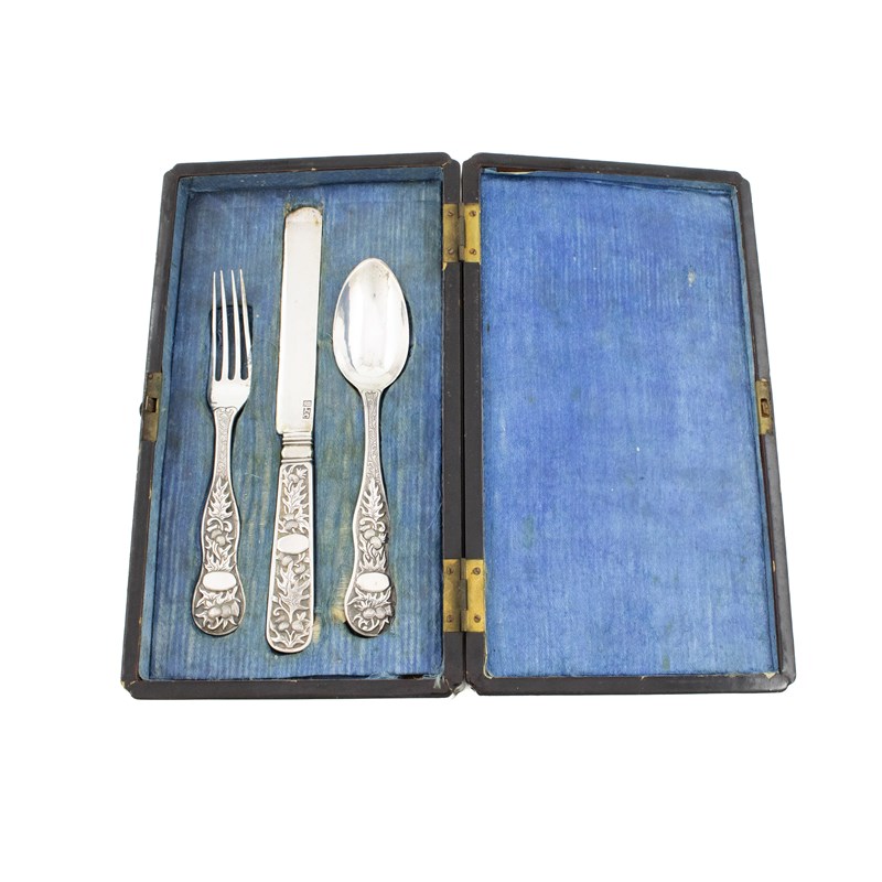 comprising: a knife, fork and spoon, chased thistle decoration, in a fitted lacquered case, approx. weight 3.5oz.