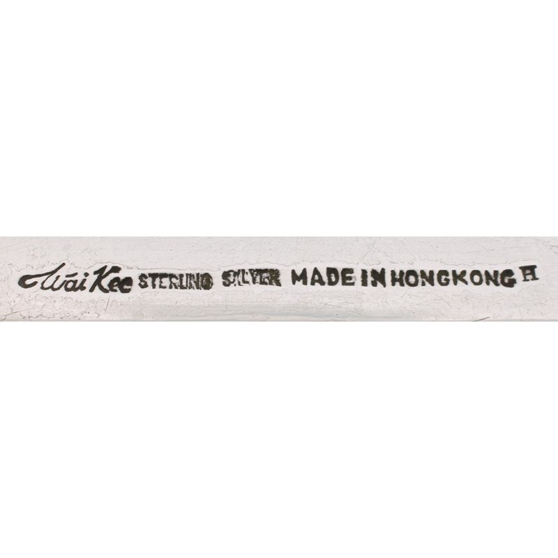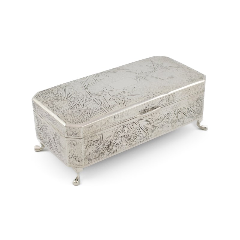 rectangular form, canted corners, engraved bamboo decoration on a matted background, on four scroll feet, velvet lined, length 14.9cm.