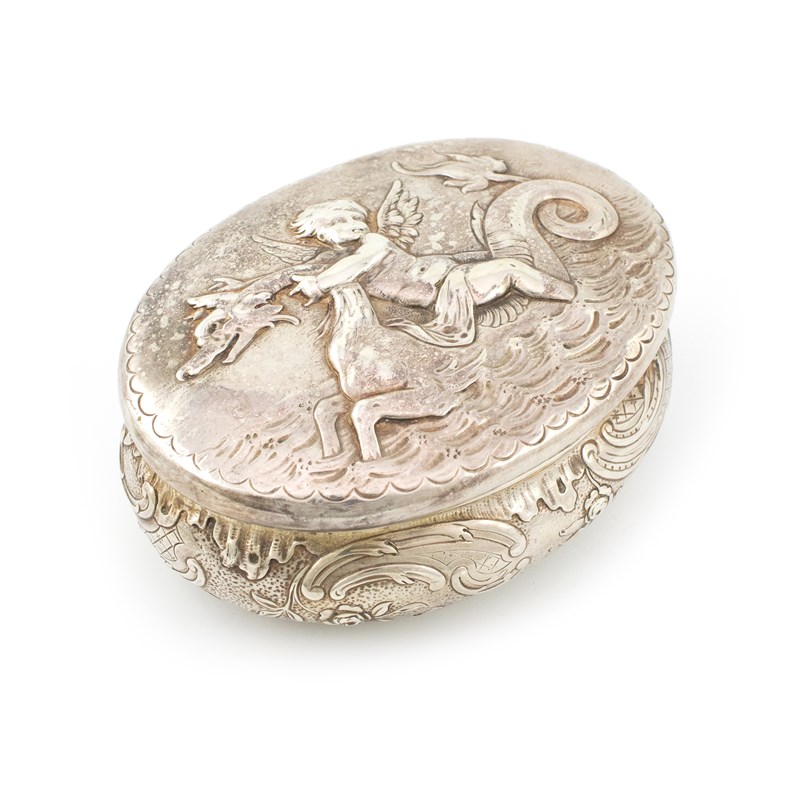 oval form, scroll foliate decoration, the hinged cover with an embossed scene of a cherub riding a hippocampus, length 13.2cm, approx. weight 7.6oz.