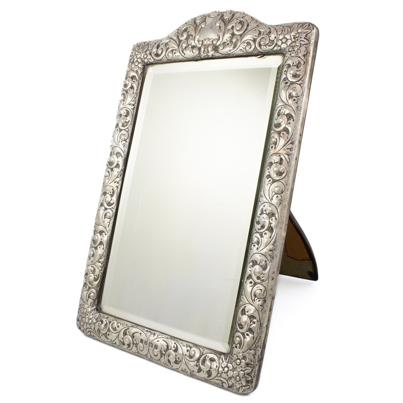 upright arched rectangular form, embossed foliate scroll decoration, easel back, height 39cm.