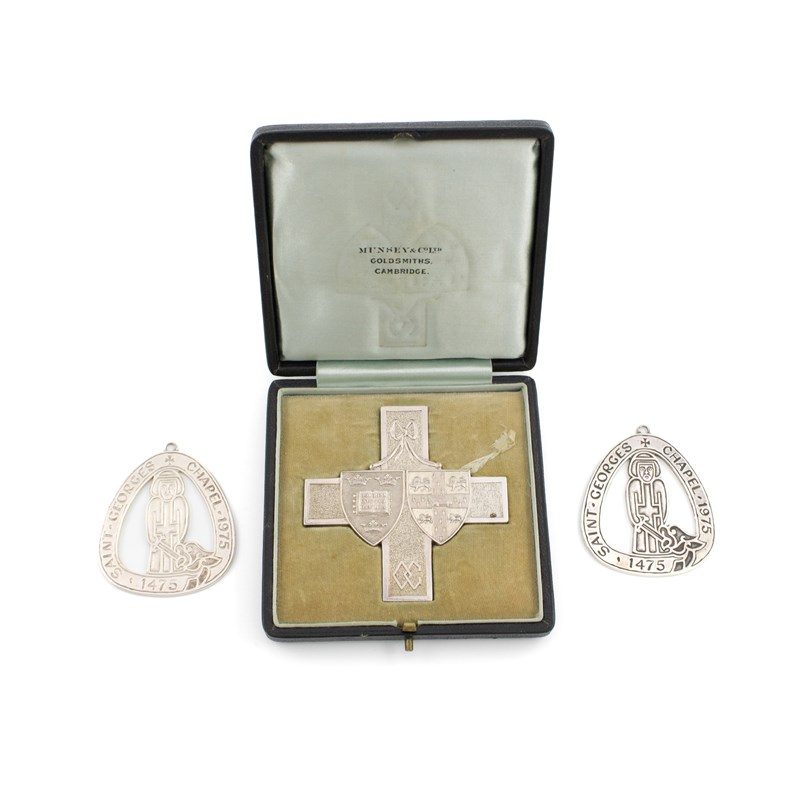 cruciform shape with shields of Oxford University and Cambridge University to the centre, inscribed to the reverse 'Bisley 1929 Humphrey Cup Match E.R Heathcote', in a fitted case, plus two commemorative anniversary medallions of St Georges Chapel, Windsor, total approx. weight 3.7oz. (3)