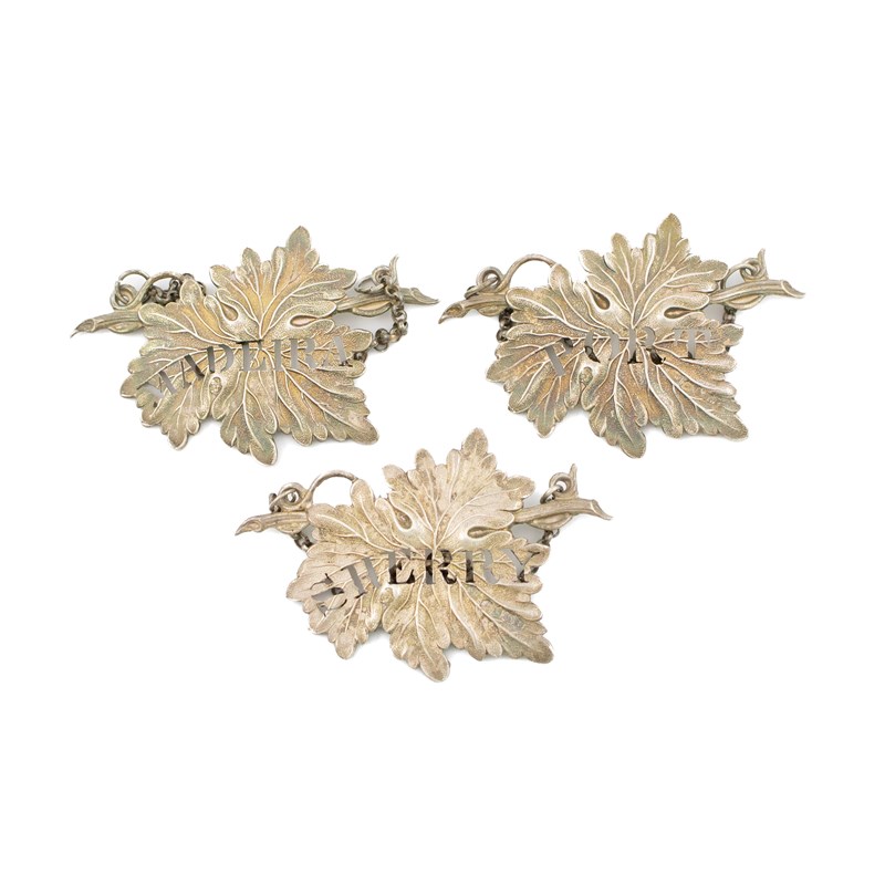 vine leaf form, pierced 'Port', 'Madeira' and 'Sherry', length 7cm, total approx weight 1.2oz. (3)