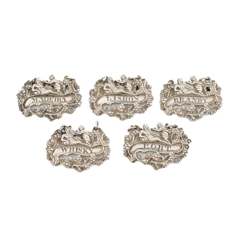 shaped oblong form, with foliate decoration and a cherub serving Bacchus, incised 'Madeira', 'Brandy', 'Port', 'Whisky' and 'Lisbon', length 5.4cm. (5)