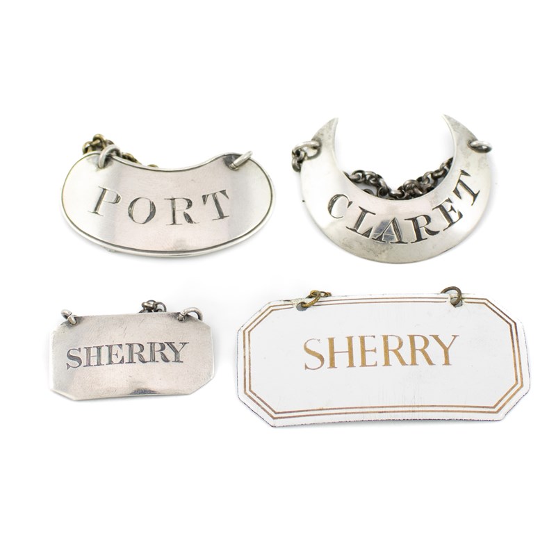 comprising silver ones: a George III crescent-shaped one by Peter and William Bateman, London1808, incised 'Claret', plus one with maker's mark three times IG, possibly for James Gordon, Aberdeen, incised 'Sherry', and one of kidney form, London 1806, incised 'Port', plus an enamel label' Sherry', approx. weight 0.7oz. (4)