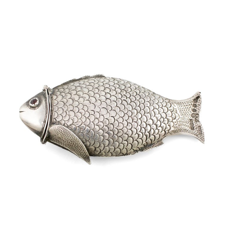 modelled as a fish, the hinged head has been set with red eyes, with a removable inner silver lining, length 8.1cm, approx. weight 1oz.