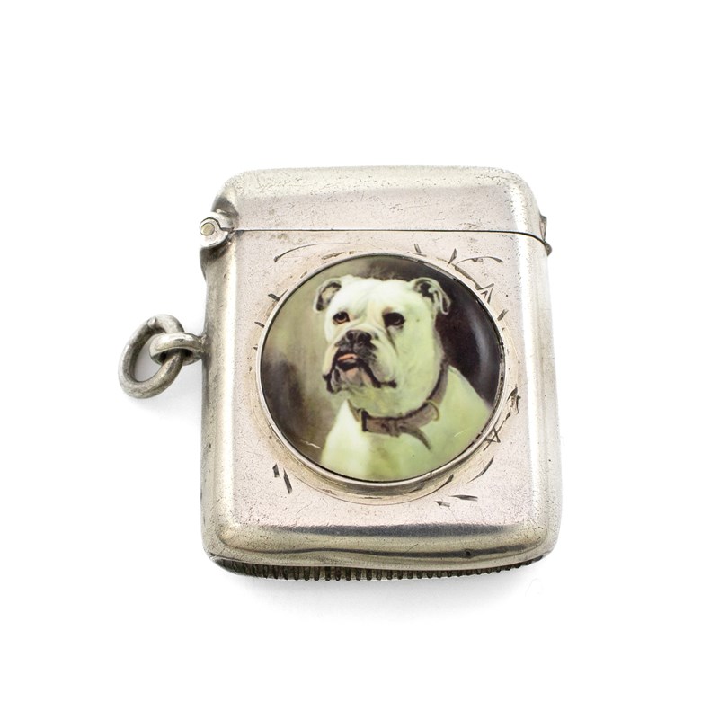 rectangular form, ring attachment, hinged cover, the front later enamelled of a boxer dog, height 4.4cm, approx. weight 1oz.