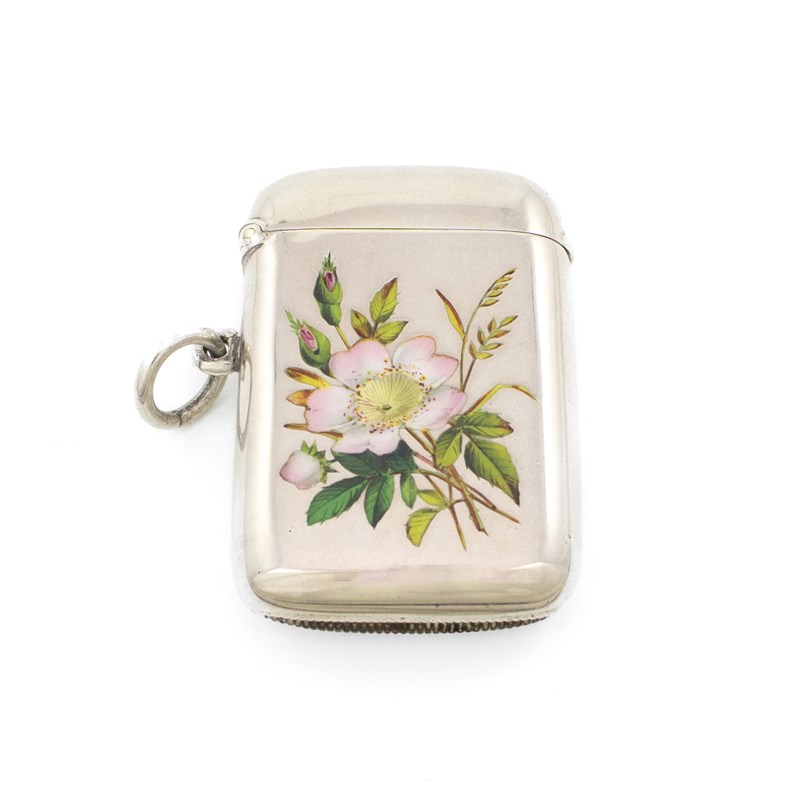 rectangular form, ring attachment to the body, hinged cover, the front enamelled with dog-rose flowers, height 5.4cm, approx. weight 0.9oz.