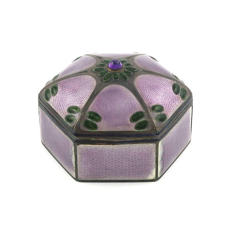 hexagonal form, with panels of purple enamel decoration, dark blue borders, the hinged cover with spines and green enamelled cabochons, and with an amethyst finial, gilded interior, length 7.9cm, approx. weight 5oz.