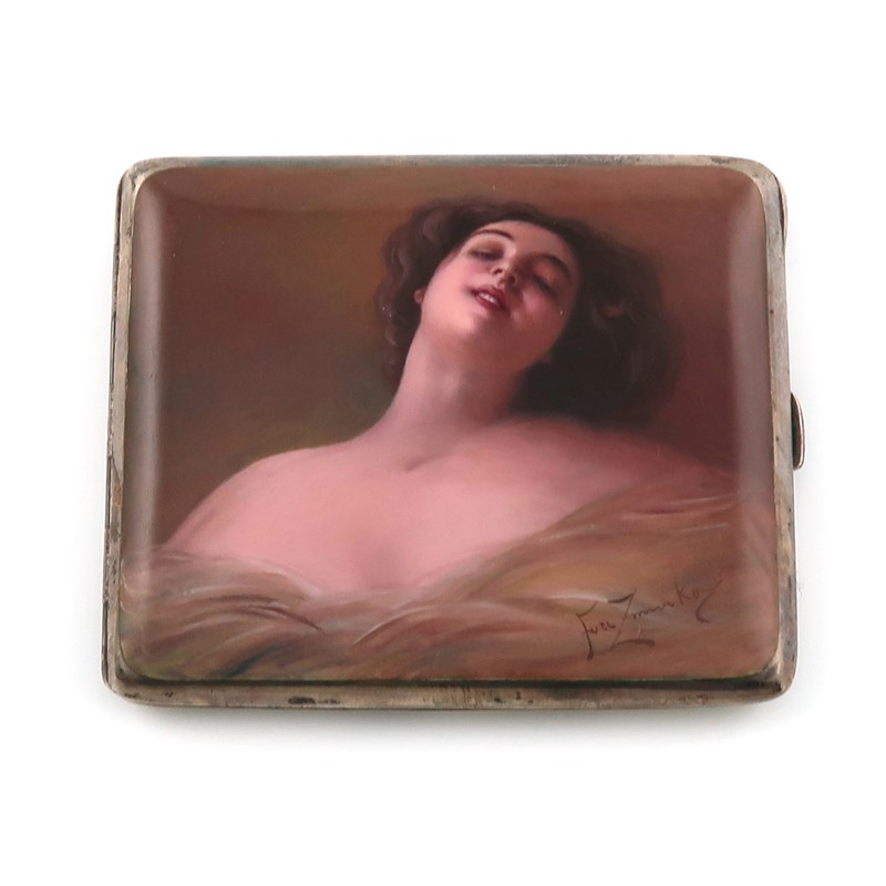 rectangular form, the hinged cover enamelled with the upper body of a lady, after the Polish artist F. Zmurko, the reverse inscribed 'Fred', length 9.5cm, approx. weight 5oz.