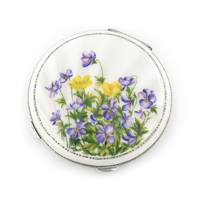 circular form, with engine-turned decoration to the base, enamelled violets and buttercups on a white background to the hinged cover, with a mirror to the inside cover, diameter 8.9cm, approx. weight 4.1oz.