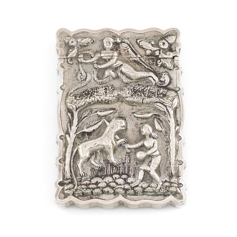 rectangular form, embossed decoration with deities with surrounding foliate decoration, the reverse shows a hunting scene with a figure killing a tiger while a deity watches in the sky, engraved with a crest, hinged cover, height 10.3cm, approx. weight 4.4oz.