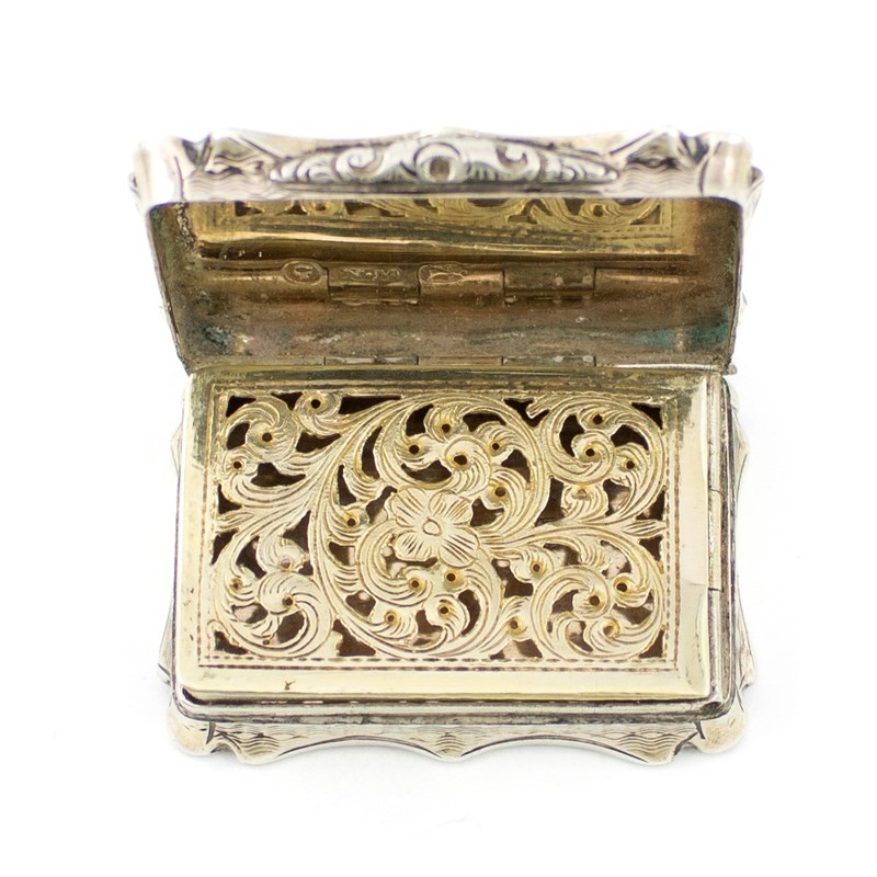 rectangular form, the cover with a view of the Cathedral, the underside with engine-turned decoration and a vacant cartouche, pierced and engraved foliate scroll grille, length 3.7cm, approx. weight 0.5oz.