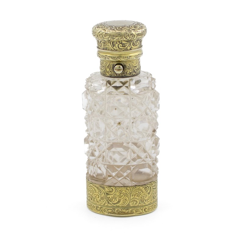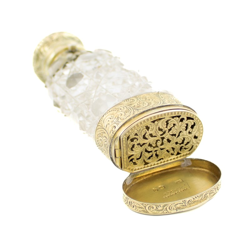 shaped rectangular form, cut glass body, engraved chased scroll foliate decoration to the silver gilt, hinged cover with a push-button clasp, the base with a vinaigrette, the hinged cover opens to reveal a pierced foliate scroll grille, height 8.9cm.