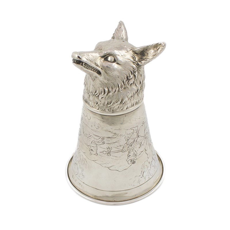 the fox head with textured fur, tapering body engraved with hunting scenes, height 13.4 cm, approx. weight 5.9oz.