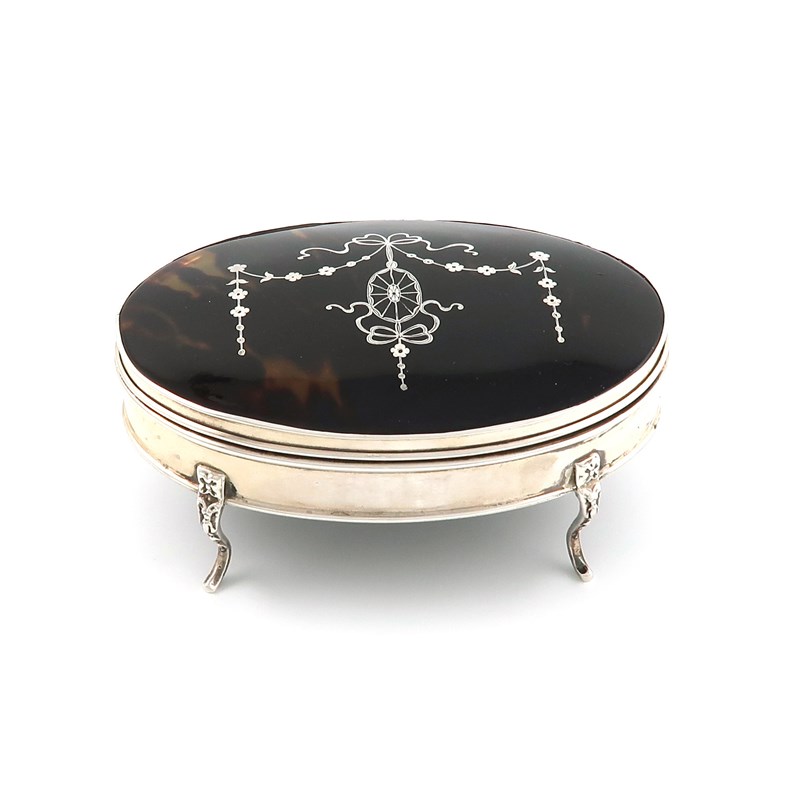 oval form, the hinged cover inlaid with ribbon-tied foliate decoration, silk lined, on four foliate legs, length 14.7cm.