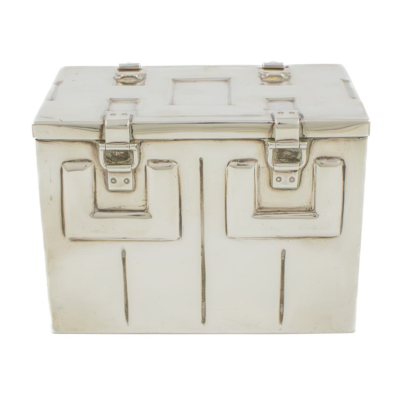 rectangular form, modelled after a military ammunition box, wooden lining, length 11.5cm.