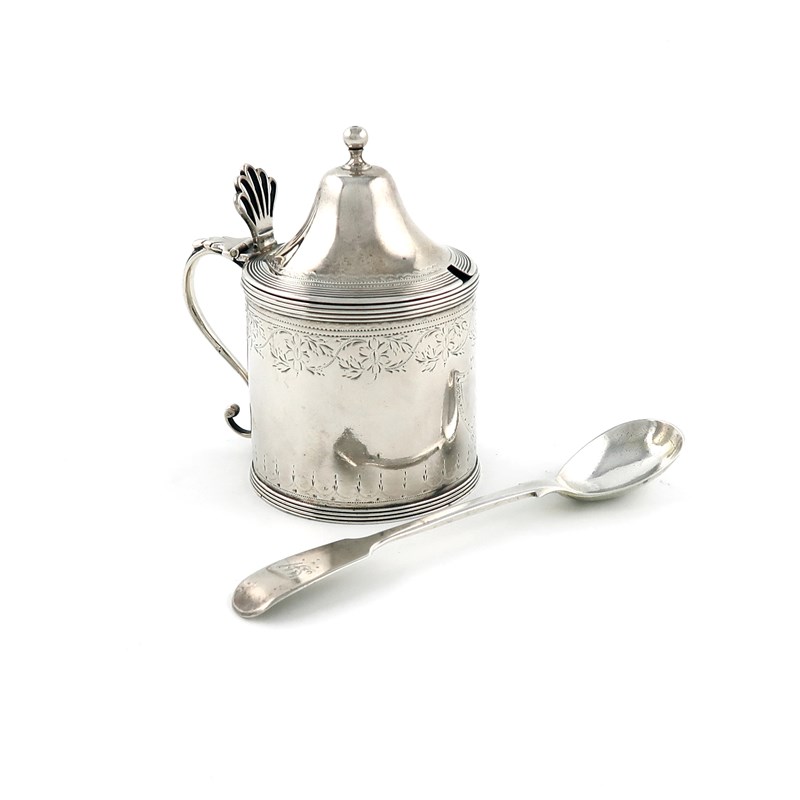 circular form, engraved foliate decoration, reeded borders, domed hinged cover with a ball finial, blue glass liner, scroll handle, height 9cm, and an early-Victorian Fiddle pattern silver mustard spoon, by John Walton, Newcastle 1842, approx. weight 4oz. (2)