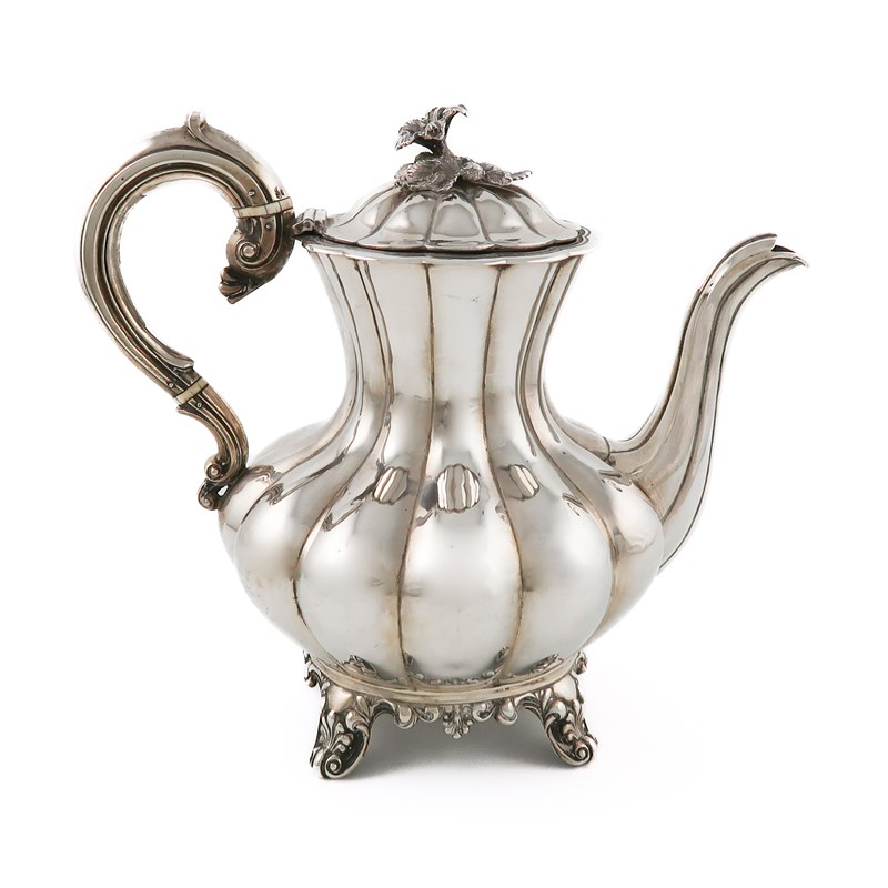 lobed baluster form, a domed hinged cover with a flower finial, scroll handle with ivory insulators, with a tapering lobed spout, on four scroll and foliate feet, height 22.5cm, approx. weight 26.5oz.