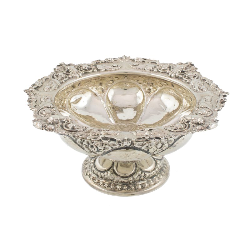 circular lobed form, chased scroll foliate border, embossed foliate decoration, on a raised circular foot, diameter 21.2cm, approx. weight 13.1oz.