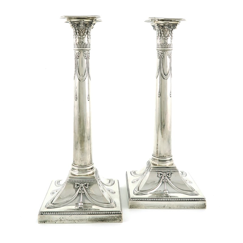 the columns with ribbon-tied swag decoration, removable drip pans, on raised squared bases, with beaded borders, height 30.8cm. (2)
