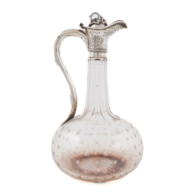 the mounts with engraved scroll foliate decoration and beaded border, scroll handle, a hinged cover with a grape and vine finial, slender neck and circular body with engraved decoration, height 25cm.