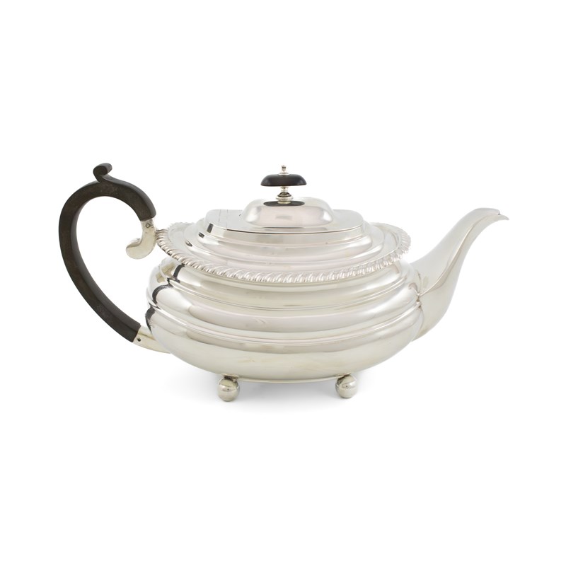 oblong bellied form, gadroon border, raised hinged cover, scroll handle and knop finial, on four ball feet, length handle to spout 28.8cm, approx. weight 23.7oz.