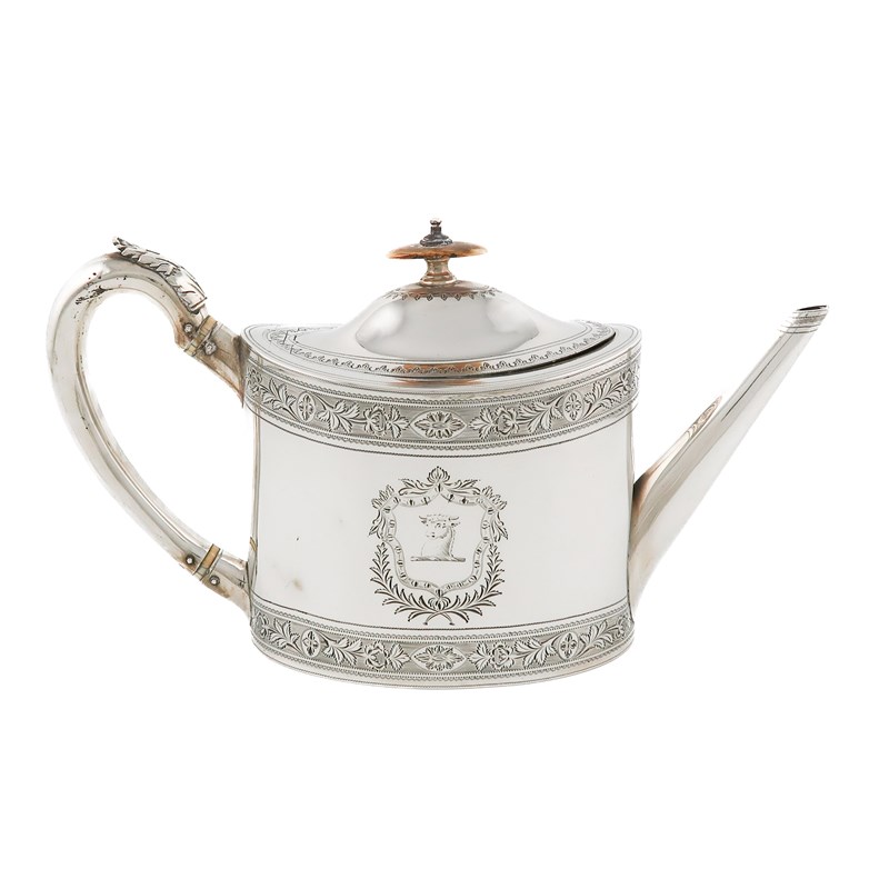 oval form, bright-cut foliate decoration and borders, hinged domed cover, scroll handle with ivory insulators, and with an ivory finial, engraved with two cartouches, one initialled and one with a crest, with a tapering spout, length handle to spout 28.5cm, approx. weight 17.8oz.