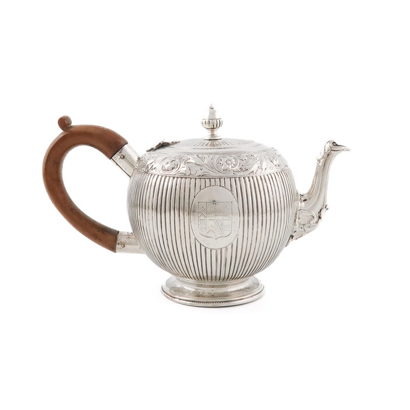 fluted bullet form, a band of scroll foliate decoration, flush hinged cover with acorn finial, two cartouches one engraved with an armorial the other engraved with two crests and a motto, scroll wooden handle, on a circular foot, length handle to spout 22cm, approx. weight 16.5oz.