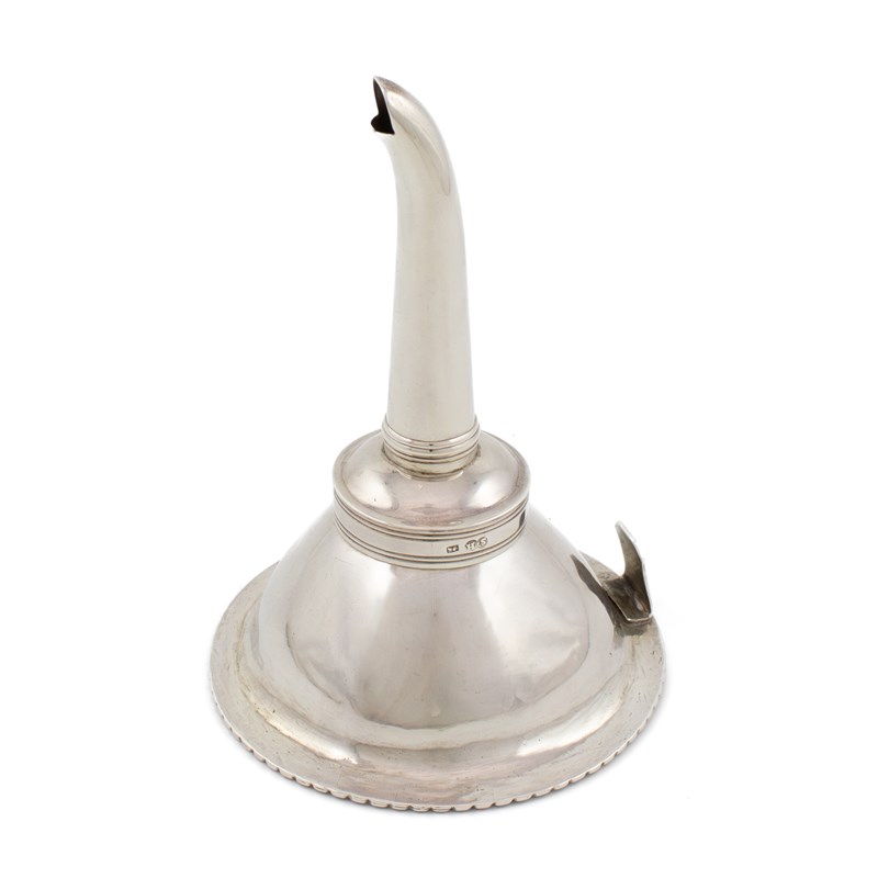 circular form, pull-off tapering spout, gadroon border with a side clip, length 13.8cm, approx. weight 4.5oz.