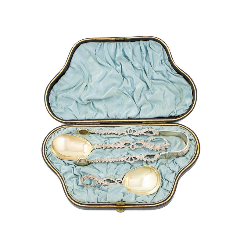 A cased Victorian silver caddy spoon, sugar spoon and tongs,