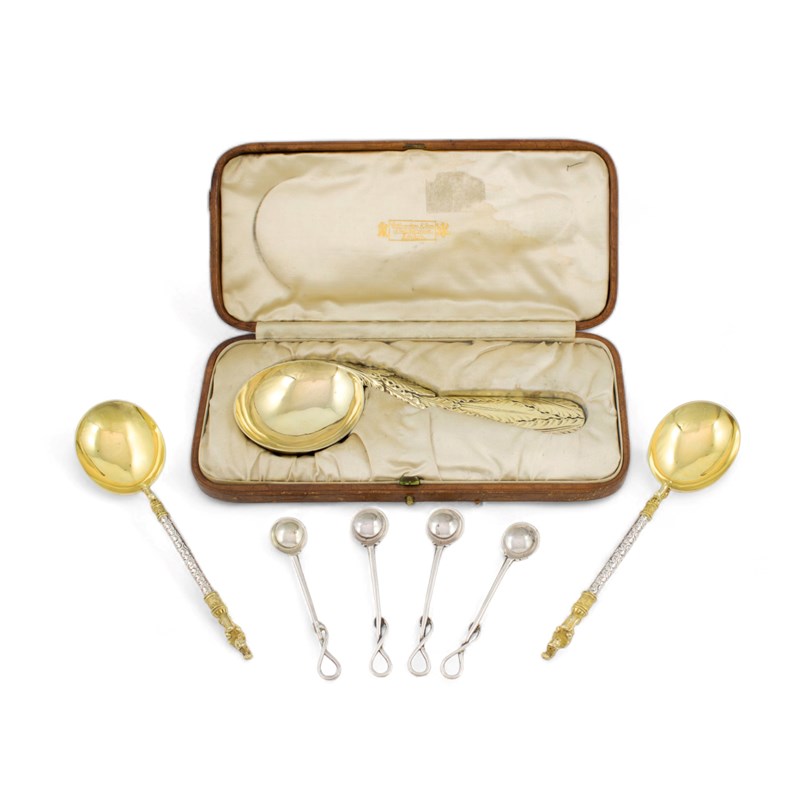 engraved acanthus leaf decoration to the curved handle, in a fitted case, plus a set of four salt spoons and a pair of fruit spoons with decorative classical head finials, total approx. weight 7.7oz. (7)