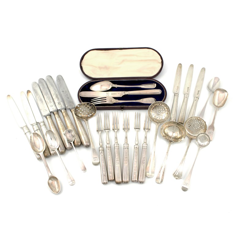 comprising: a Victorian silver cased Fiddle and Thread knife, fork and spoon, by George Adams, London 1848, plus six fruit knives and forks, four dessert knives, five sifting ladles, a medicine spoon, and other items, total approx. weighable 10.2oz (29)