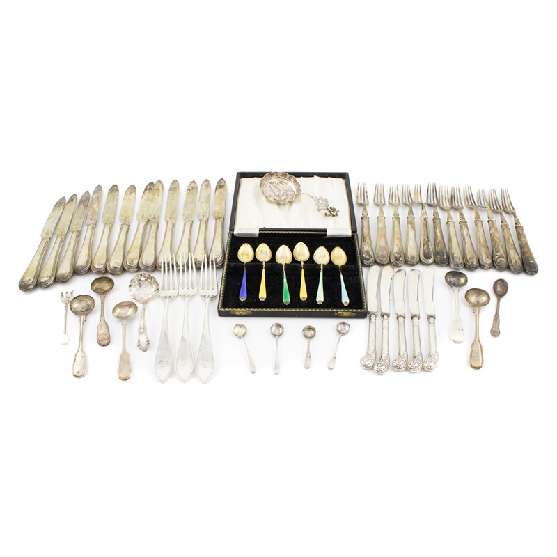 beaded borders to the handles and engraved foliate decoration to the blades, case a.f, plus ten salt spoons, four fruit knives, a cased set of silver-gilt and enamel teaspoons and other items, total approx. weighable 45oz. (qty)