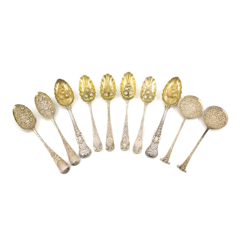 comprising: a pair of Coburg pattern tablespoons, by Eley and Fearn, London 1820, with later berry decoration, four Hanoverian tablespoons with later berry decoration, a pair of floral decorated tablespoons with later berry decoration, and a pair of Victorian Onslow pattern spoons with embossed floral decoration to the round bowls, total approx. weight 24.2oz. (10)