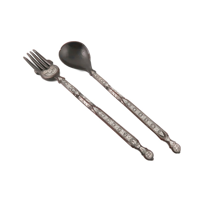 A metalware inlaid wooden serving fork and spoon,