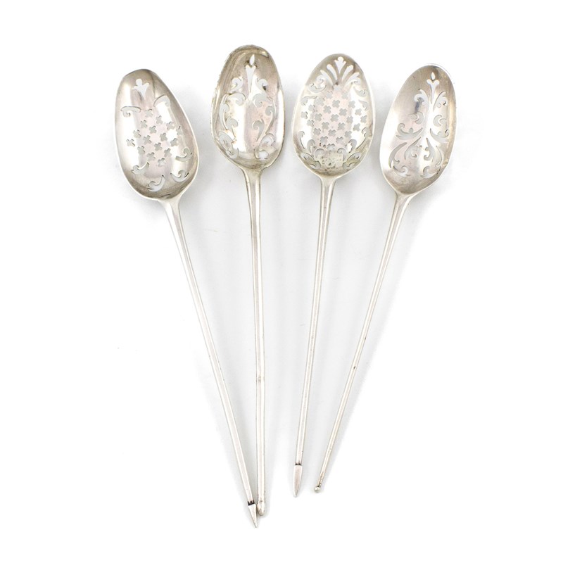 including: one marked possibly 'TM' with a shell heel, one with a scratched 'H' into the heel, two pierced with scroll decoration, total approx. weight 0.9oz. (4)