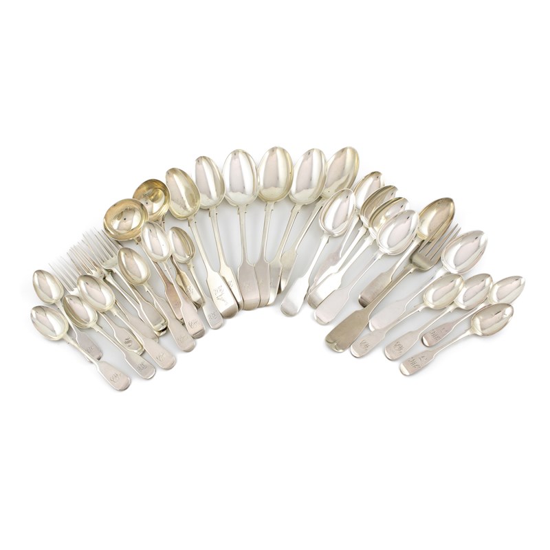 most engraved with initals and crests to the terminals, comprising: six tablespoons, seven dessert spoons, eleven teaspoons, a table fork, five dessert forks, and two ladles, total approx. weight 47.4oz. (32)