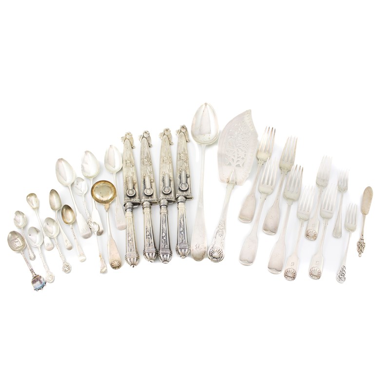 silver items comprising: a Scottish serving spoon, four Scottish table forks, three Scottish dessert spoons, three Scottish dessert forks, fish slice, a set of four silver-plated 'gaucho' knives and other items, total approx. weighable 30.4oz. (28)