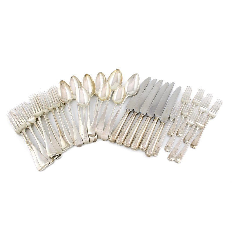 some with engraved crests or initials to the terminals, comprising: eleven table forks, eight dessert forks, six modern dessert knives, six tablespoons and three dessert spoons, total approx. weighable 45.8oz. (34)