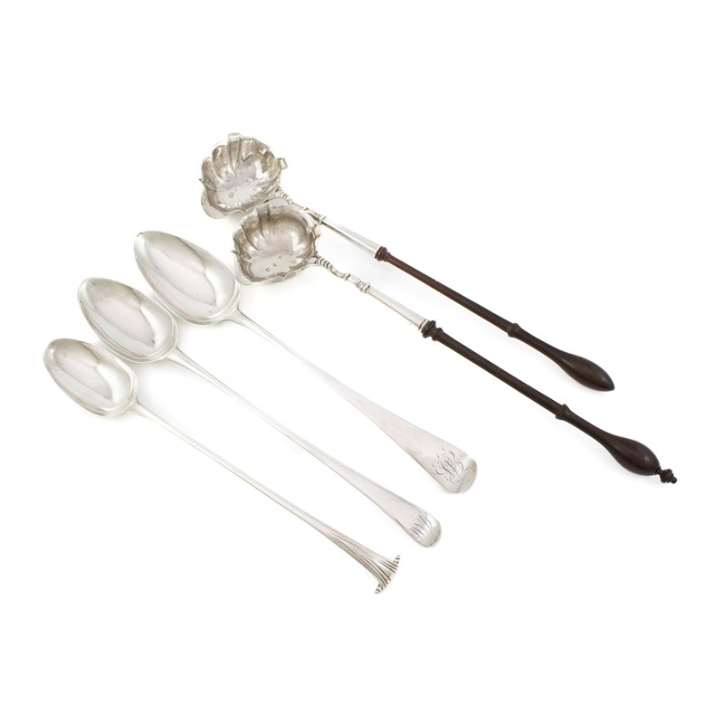 with engraved initials to the terminal, plus an Onslow pattern basting spoon, worn marks, with scratched initials to the underside of the terminal and another basting spoon marked W.F, with engraved initials and two George II silver punch ladles with turned wooden handles, total approx. weighable 9oz. (5)