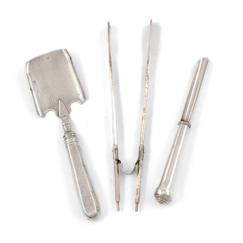 modelled as two rowing oars, plus a George IV silver apple corer, possibly John Harris IV, London circa 1820, and a 19th century Russian silver serving slice, worn marks, engine-turned decoration and engraved initials to the terminal, length 19.6cm, total approx. weight 4.1oz. (3)