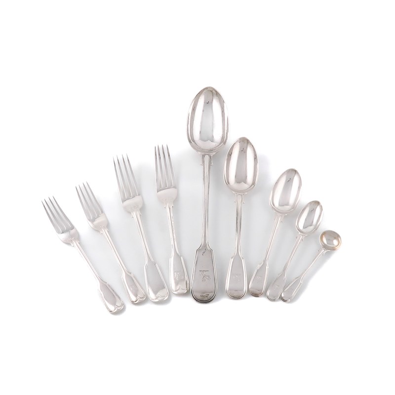 comprising: two serving spoons, sixteen table forks, three tablespoons, three dessert forks, eight teaspoons, by John Hunt & Robert Roskell, London from 1865 to 1874, eight table forks, four dessert forks, four dessert spoons, three teaspoons and two salt spoons by John Samuel Hunt, London 1859, and one tablespoon by George Adams, London 1857, total approx. weight 127.8oz. (54)