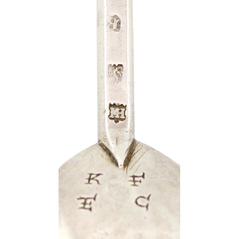 fig-shaped bowls, the reverse of the bowls scratch initialled 'KF' over 'EC', faceted tapering stems, the gilded finials with pierced nimbi, length 18cm, approx. weight 4oz. (2)