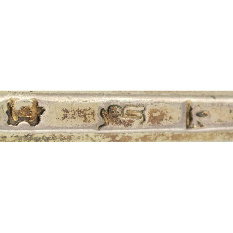 later gilded, the reverse of the fig-shaped bowl with old collection labels, tapering faceted stems, the lion finials each supporting a shield, length 17.2cm, approx. total weight 2.7oz. (2)
